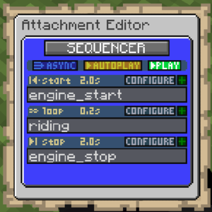 The sequencer attachment is like the real-life equivalent of a music sequencer. It can be used to activate effects in sequence on a loop. It supports the engine start-loop-stop logic to allow for realistic train engine sounds to be played. The sequencer itself does not configure any sounds. It activates other named effect attachments like the sound attachment.